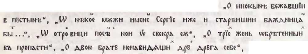 „За мъжа, отишъл в манастир заедно със своя син“ (л. 73б), „За монах, който вадил вода от кладенец“ (л. 74а), „За видния езичник, приел християнството“ (л. 78б—79а), „За отшелника, намерил у брата си петдесет жълтици“ (л. 80а), „За монаха, комуто се приискал мек хляб“ (л. 80а), „За каменаря Евлогий“, „Монахът и разбойниците“ (л. 78а—78б), „За златаря Андроник и жена му Атанасия“ (л. 105б—110б), „За отец Пинуфий“ (л. 110б—112а). За пръв път тук могат да се посочат протографите на тези преписи — ръкописи № 3/2, 2/25 и 3/5 от сбирката на Рилския манастир, от които Теофан е преписвал, без да внася каквито и да било изменения.