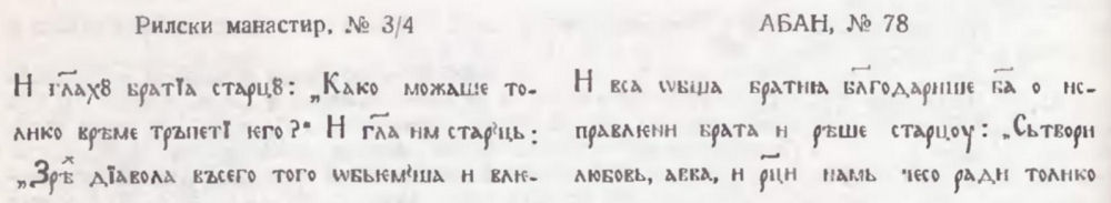 Поради това съм датирала отново всички използувани тук ръкописи от библиотеката на Рилския манастир. Азбучно-Ерусалимският патерик № 3/2 досега е смятан за ръкопис от XVII в. (вж. Б. Цонев. Ръкописи в библиотеката при Рилския манастир, с. 95 ; Е. Спространов. Цит. съч., с. 50—51 Л. Милетич. Цит. ст., с. 160). Обаче водните знаци, които се срещат в него, дават основания категорично да бъде отнесен към края на XIV в.