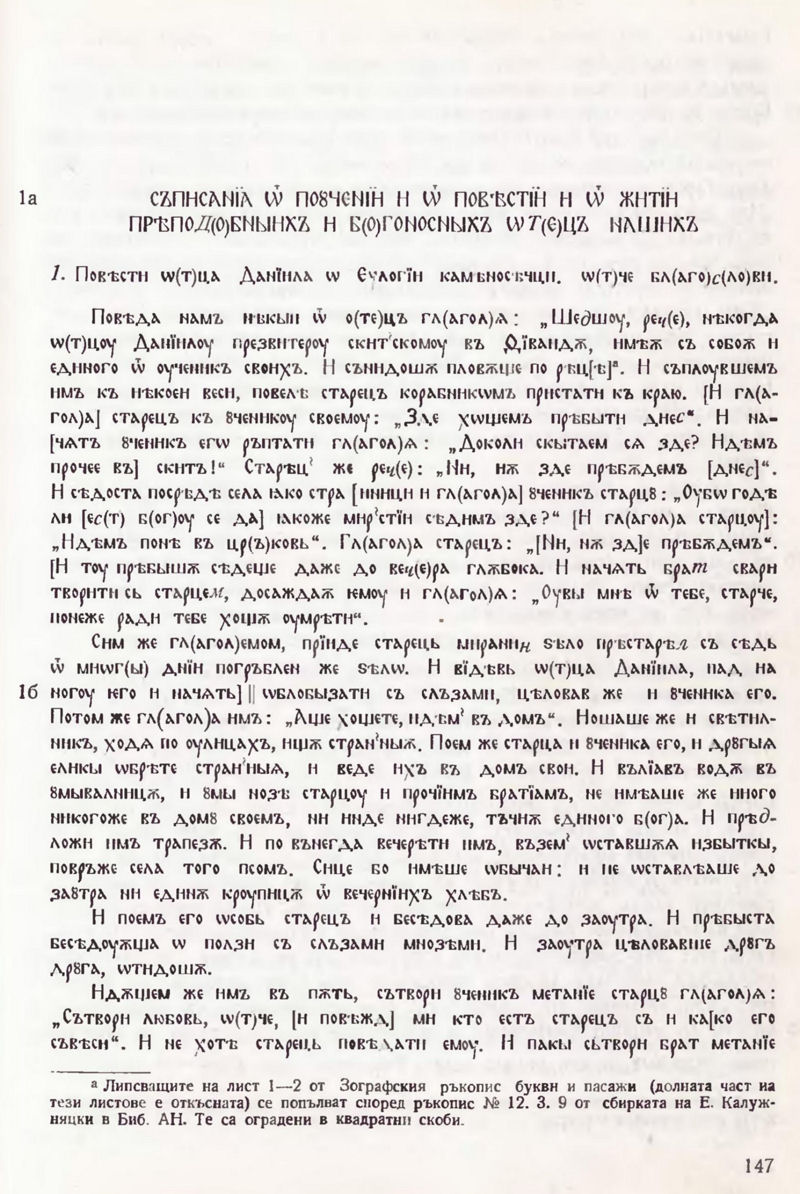 2. Настоящата книга беше завършена окончателно и предадена за печат през 1978 г. Ето защо тук не са използувани резултатите от палеографското проучване на хилендарските ръкописи, отразени в описа на Д. Богдановић. Каталог ћирилских рукописи манастира Хиландара. Београд, 1978. Тук ще отбележа само, че в описа на Д. Богдановић ръкопис № 418 е отнесен към края на XIV в. и неправилно е определен като Скитски патерик.