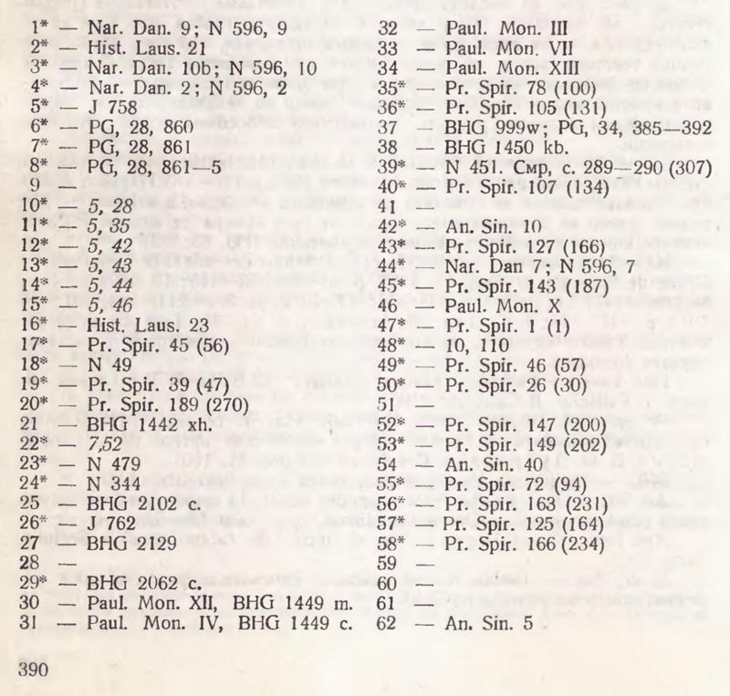* — Всички текстове, означени със звездичка, са поместени в пълните славянски преводи на патеричните сборници. За Apophthegmata Patrum — W. R. Veder. La tradition slave des Apophthegmata Patrum. — Slovo, 24, 1974, p. 66—93; M. Capaldo. La tradizione slava della collezione alfabetico-anonima degli Apophthegmata Patrum. — Ricerche slavistiche, XXII—XXIII, 1975—1976, p. 110—120; N. van Wijk. Подробный обзор церковнославянского перевода Большого Лимонария. — Byzantinoslavica VI, 1935—1936, р. 38—83; за Pr. Spir. — В. С. Голышенко, В. Ф. Дубровина. Цит. съч.; за Hist. Mon. и Hist. Laus. — И. П. Еремин. К истории древнерусской переводной повести. — ТОДРЛ, III 1936, с. 37—57;