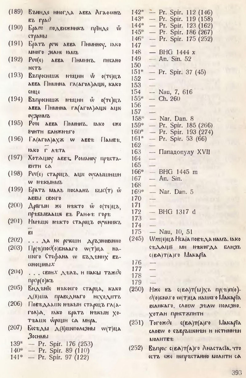 NJ — Apophthegmata Patrum: F. Nаu. Histoire des solitaires Egyptiens. — Revue de l’Orient Chretien, 12, 1907, p. 43—69, 393—413; 13, 1908, p. 47—66, 266—297; 14, 1909, p. 357—379; 17, 1912, p. 204—211, 294, 301; 18, 1913, p. 137 146; J. C. Guy. Recherches..., p. 64—74. Тези сигли се използуват само в случаите, когато произведението не фигурира в систематичната колекция.