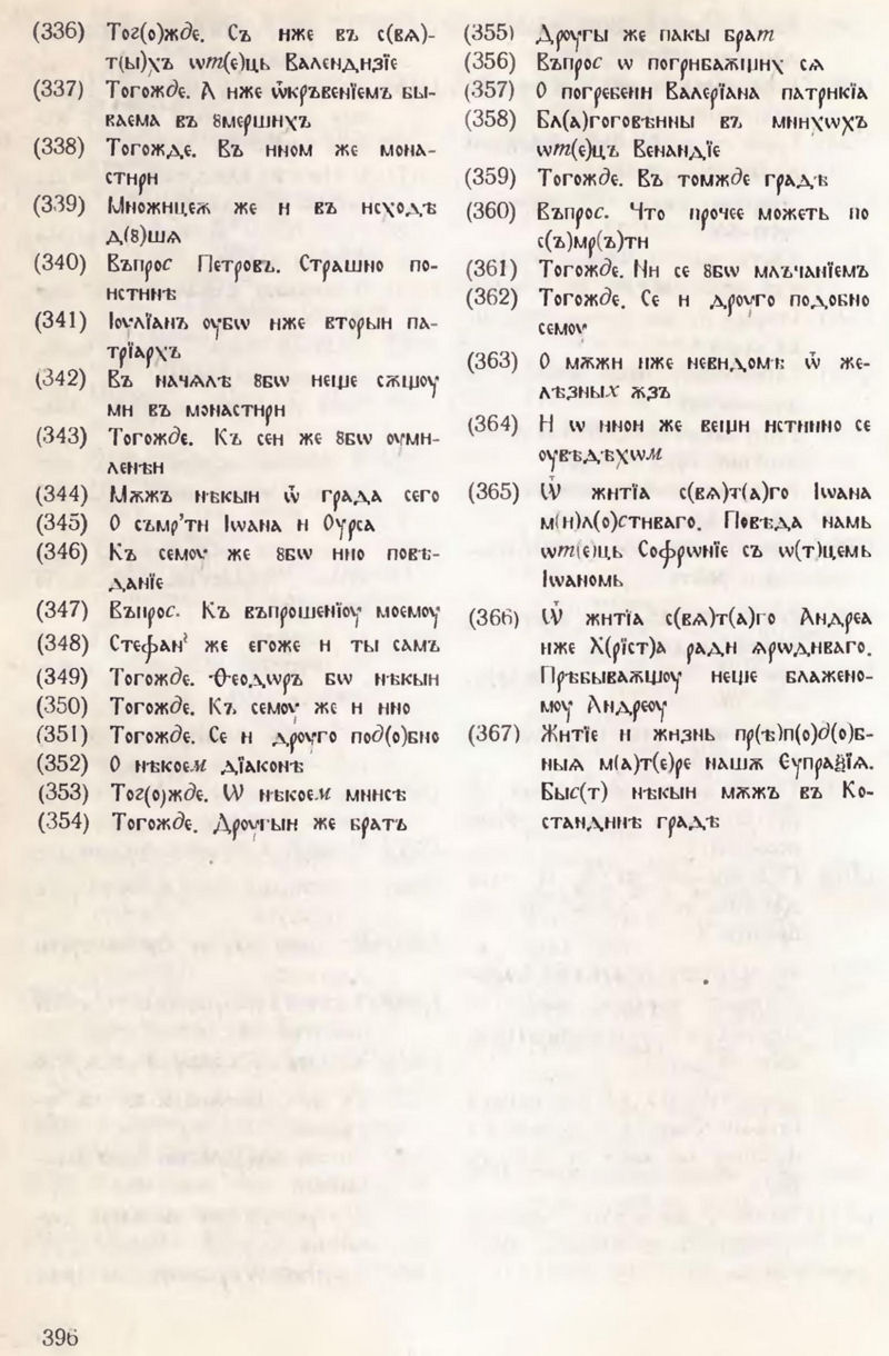 | 3—9, 86, 11, (11—13), 12—24, (28), 25, 129, 26, 130, (96) 131, 98, 27, 132, 133, 28—30, 134—136, 31—67, (72), 68—85, 89, 88, 125, 90, (140), 91—103, 137, 104—108, 87, 109, 110, (161—163), от житието на Сава, от Диалозите на Григорий Двоеслов, от житието на Йоан Милостиви, от житието на Андрей Юродиви, патерични разкази и поучения, 111—114, 223, (168), 115, 224, За Козмиани, 225, За монахиня, избягала в пустинята, 226, 116, (104), 76, 117, 138, 118—120, (179), 121—123, 139—144, 145—155, 157—171, Житие на Евпраксия, Житие на Мария Египтянка, Житие на Ефросина.