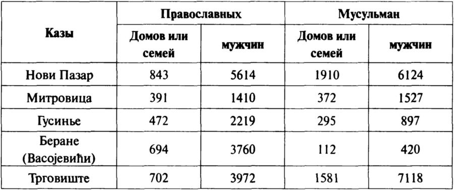 данные по числу домов и мужчин. В 60-е годы XIX века австро-венгерские офицеры для составления своих планов по Боснии и Герцеговине собирали сведения о населении Боснийского вилайета. Майор генерального штаба Йохан Роскиевич, служивший в австрийском консульстве в Сараево, опубликовал в 1865 году в Военно-географическом институте в Вене карту «Bosnien, die Herzegovina und Rascien» («Босния, Герцеговина и Рашка»), на которой он представил данные об административном разделении, численности и религиозной структуре населения. Рашка, то есть округ (санджак) Нови Пазар с центром в Сеннице «Rascien, Kreis Novibazar mitdem Amtssitzezu Sjenica» делится на казы — Нови Пазар, Митровица, Нова Варош, Бихор, Трговиште, Таслиджа, Приеполе, Колашин, Гусинье и Васоевичи. Область населяло 125 000 жителей, из которых православных было 100 000, мусульман — 23 000, цыган —1800 и евреев — 200 [1]. Эти данные являются результатом его исследований в течение 1863 и 1864 годов. Густав фон Темел, австрийский офицер и дипломат, опубликовал в 1867 году работу о Боснийском вилайете с данными о религиозной структуре населения по санджакам. В Новопазарском санджаке, то есть в Рашке, по словам Темела, проживало: 61 150 мусульман, 79 948 православных («эллино-ориентальных») христиан, 807 цыган и 95 евреев («израильтян») [2]. В соответствии с турецкой переписью населения, проведенной в 1865 году, религиозная структура Новопазарского санджака выглядела следующим образом [3]: