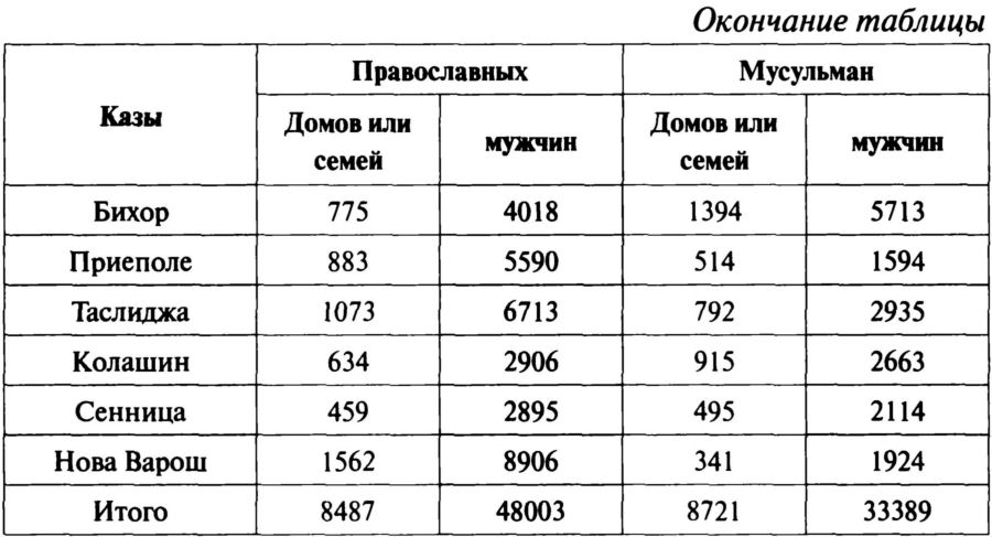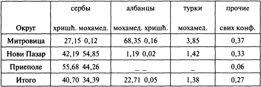 состоящая из 598 000 жителей, выглядела следующим образом: католические албанцы — 69 300; мусульманские албанцы — 264 800; мусульманские сербы — 89 000, восточно-православные сербы —134 000, болгары — 24 000, прочие (православные, католики, евреи и албанцы) —15 814 [1]. Более крупными населенными местами на обозначенной территории были Приштина —15 000 — 20 000 жителей, Печ —15 000, Джаковица — 25 000, Шкодер — 29 000 и Призрен — 38 000 жителей. Генерал Бек пишет, что в Сеннице проживает две трети «сербов-мусульман» (остальные — православные) и находится 500 домов («Sjenica, 2/3 mohamed.Serben,500Häuser»), Нови Пазар — главный населенный пункт на территории Тара-Ибар и имеет 2000 домов, где «сербы-мусульмане» и православные живут вместе («NoviPäzar, Hauptort des Tara-Ibar Gebietes, 2000 Häuser, moham. Serben und greich.orient. Serben gemischt») [2].