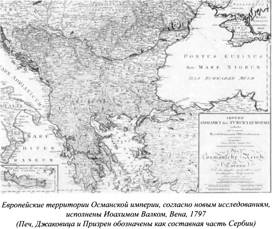 3. Европейские территории Османской империи, согласно новым исследованиям, исполнены Иоахимом Валком, Вена, 1797 (Печ, Джаковица и Призрен обозначены как составная часть Сербии)