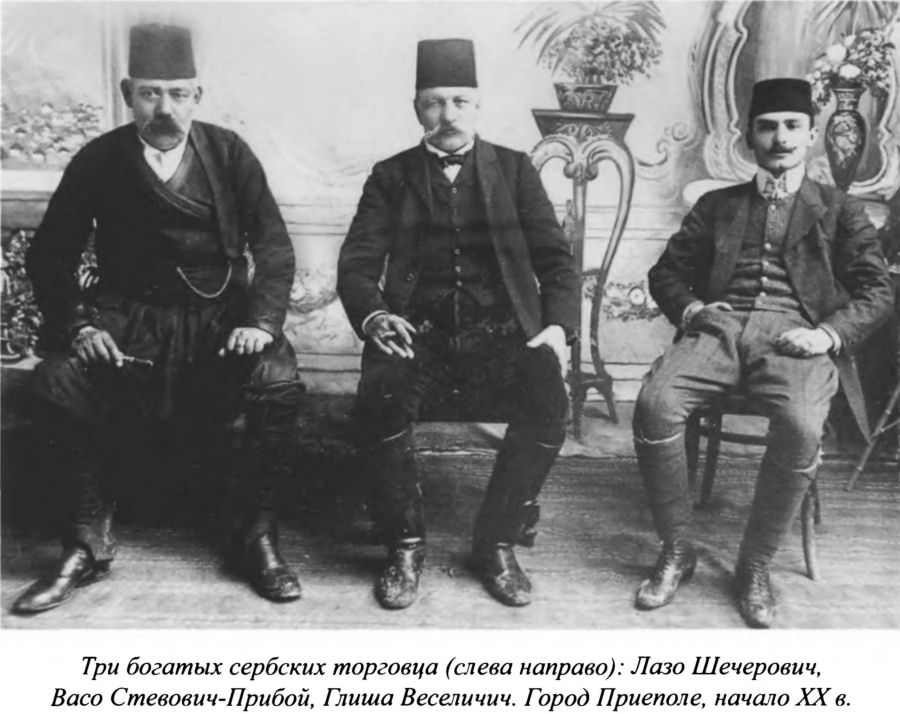 15. Три богатых сербских торговца (слева направо): Лазо Шечерович, Васо Стевович-Прибой, Глиша Веселичич. Город Приеполе, начало XX в.