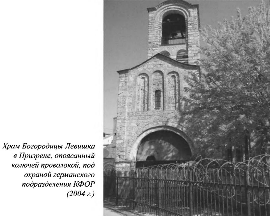39. Храм Богородицы Левишка в Призрене, опоясанный колючей проволокой, под охраной германского подразделения КФОР (2004 г.)