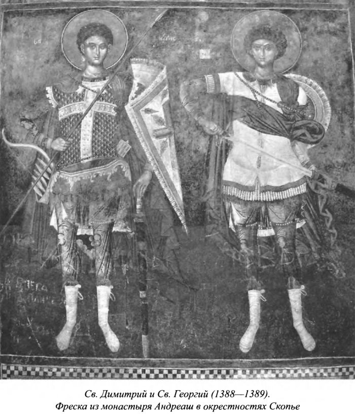49. Св. Димитрий и Св. Георгий (1388—1389). Фреска из монастыря Андреаш в окрестностях Скопье