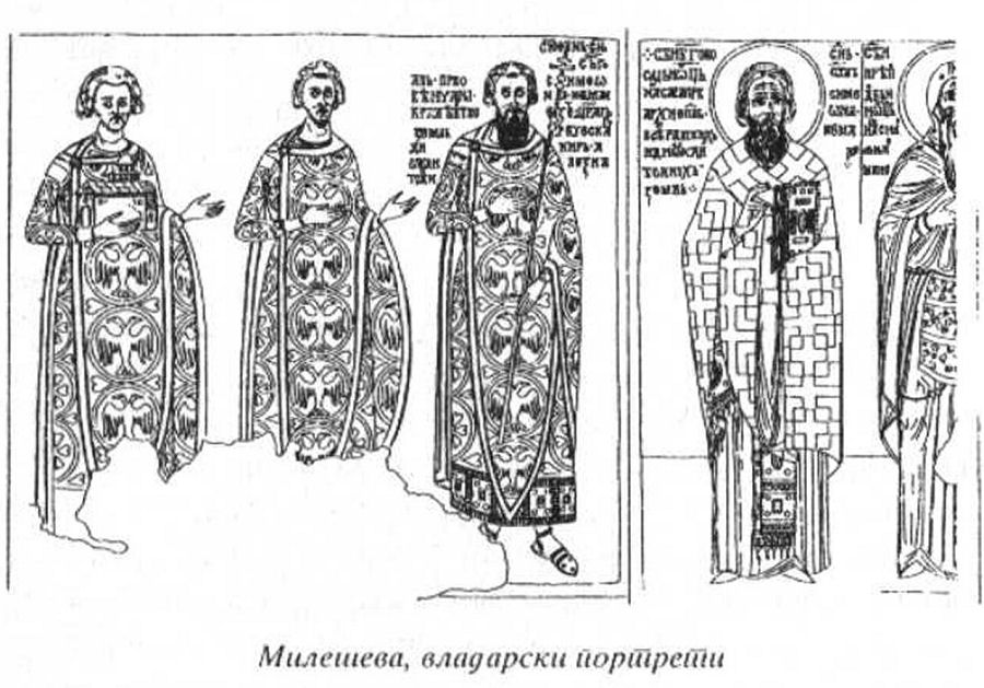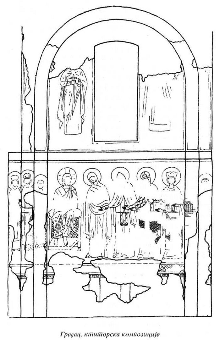 су на потрбушју олтарског лука; апостоли су у певницама, ратници на западним пиластрима и око њих, а монаси у припрати. Међу њима се висином фигуре, која заузима два појаса одређена за стојеће фигуре, истиче св. Стефан. заштитник династије. Владислав је сликама узвеличао своју породицу, јер је, поред свог ктиторског портрета у наосу, поручио да се на северној страни припрате прикажу сви њени чланови: за Стефаном Немањом ступају св. Сава, Стефан Првовенчани, Радослав и он сам, са сликаним моделом цркве у руци. Породична слика Немањића изражавала је, у исто време, став према Византинцима, јер су наспрамио, на јужном зиду припрате, били насликани Константин и Јелена са савременим царем Никејског Царства, Јованом Ватацом, а у натписима уз главе српских државних достојанственика забележене су, поред српских, и њихове византијске дворске титуле. Осећање духовне зависности од Византије било је основна садржина ове слике.