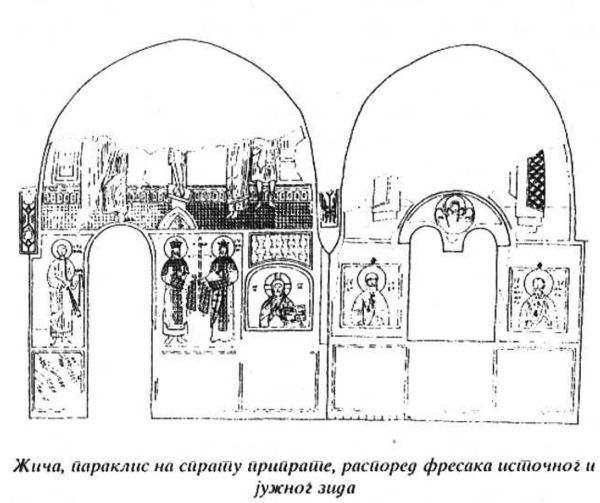 Жича, параклис на страну припрате, распоред фресака источног и јужног зида