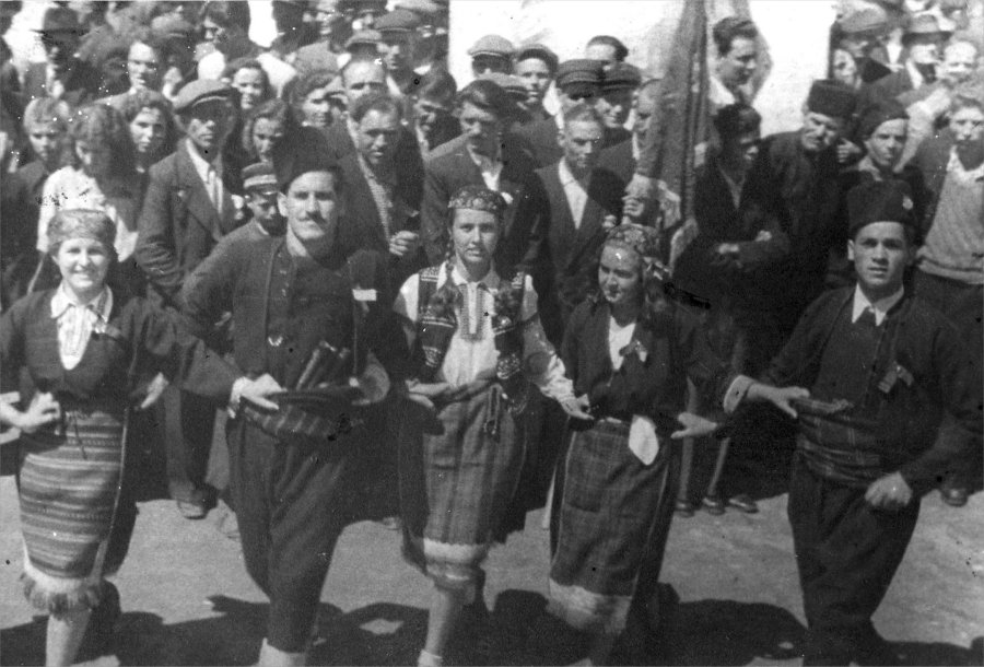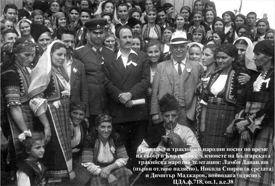 168. Граждани в тракийски народни носии по време на събор в Кърджали с членовете на Българската тракийска народна делегация: Ламби Данаилов (първи отляво надясно), Никола Спиров (в средата) и Димитър Маджаров, войводата (вдясно). (ЦДА, ф.718, оп.1, а.е.38)