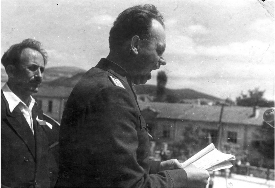 168. Граждани в тракийски народни носии по време на събор в Кърджали с членовете на Българската тракийска народна делегация: Ламби Данаилов (първи отляво надясно), Никола Спиров (в средата) и Димитър Маджаров, войводата (вдясно). ЦДА, ф.718, оп.1, а.е.38