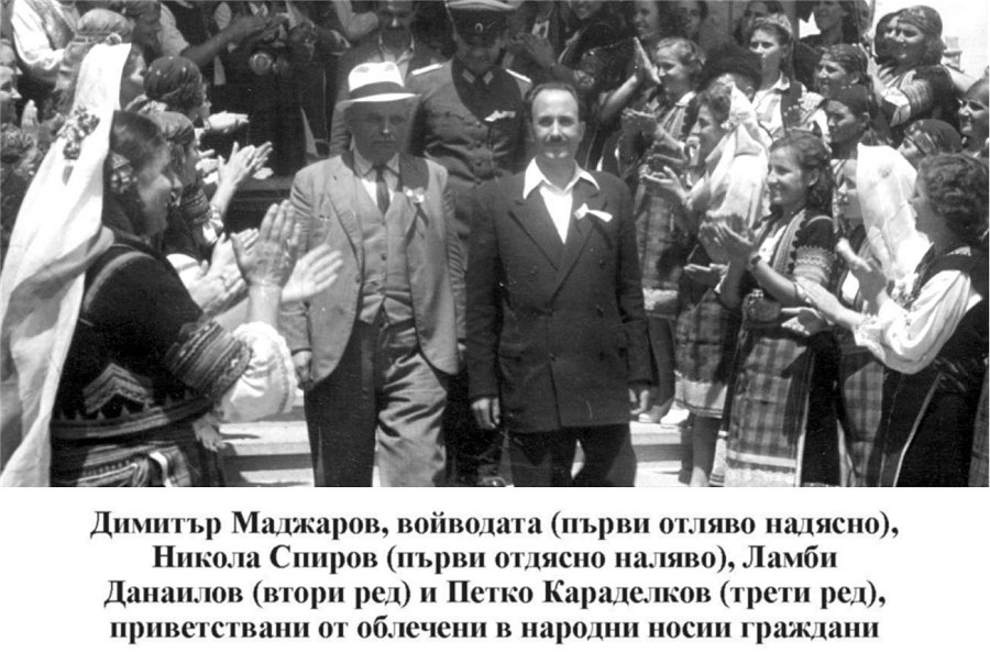 167. Димитър Маджаров, войводата (първи отляво надясно), Никола Спиров (първи отдясно наляво), Ламби Данаилов (втори ред) и Петко Караделков (трети ред), приветствани от облечени в народни носии граждани