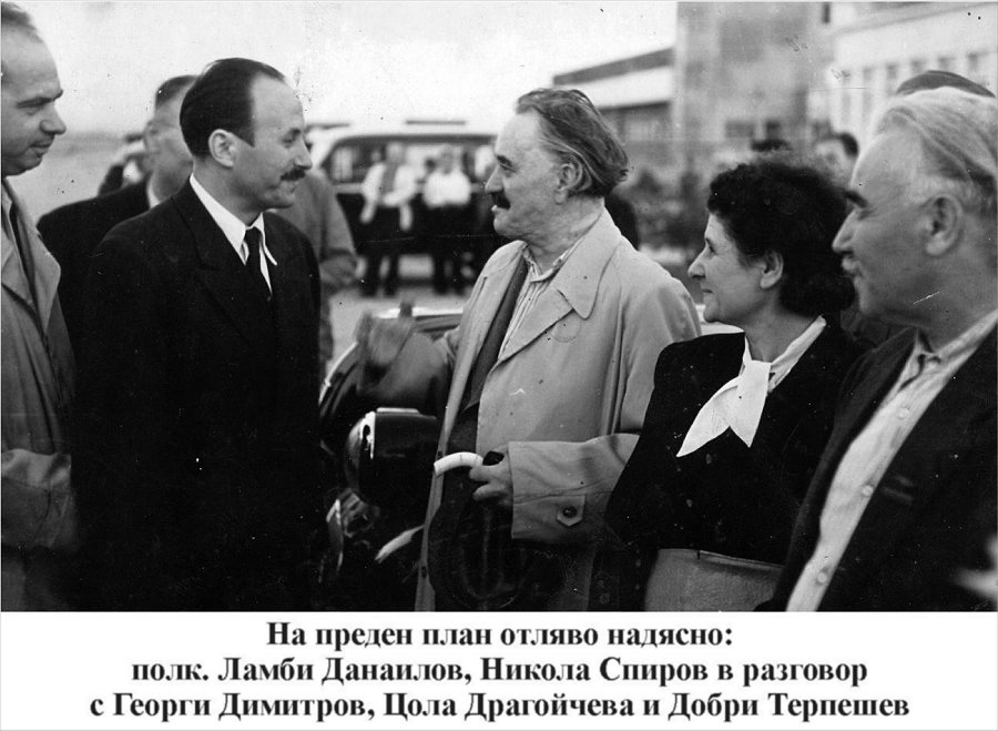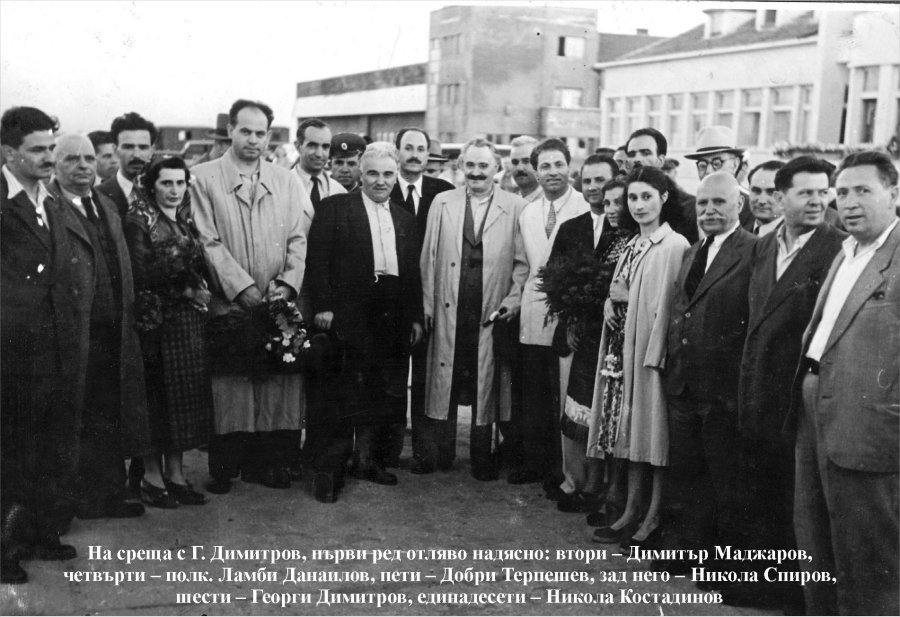 На среща с Г. Димитров, първи ред отляво надясно: първи – Димитър Маджаров, трети – полк. Ламби Данаилов, пети - Никола Спиров, шести – Георги Димитров в разговор с Добри Терепешев, единадести – Никола Костадинов