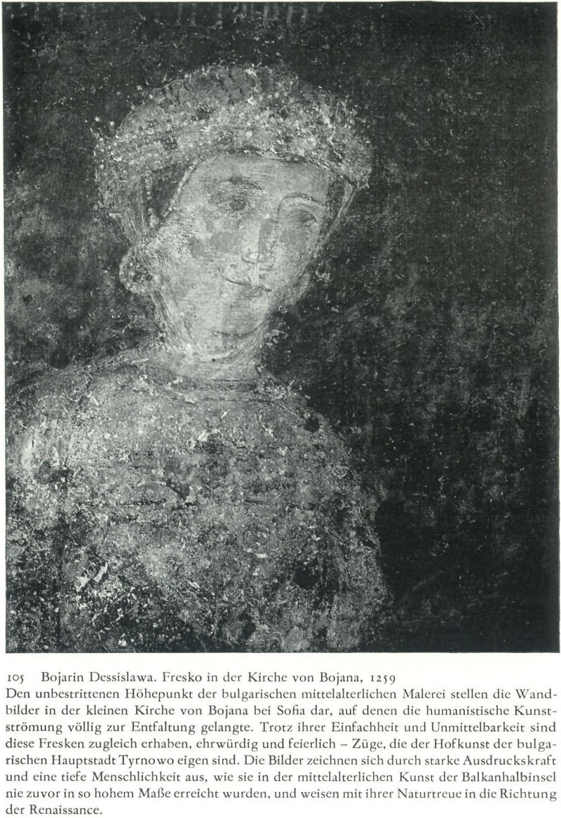 innerhalb der bulgarischen Gesellschaft im zweiten Drittel des 13. Jahrhunderts auch gewesen sein mögen, sie sprengten den Rahmen des Mittelalters nicht, führten zu keinem Sieg des Individuums und schlugen keine Brücke zur Kultur der Renaissance. Von ihr ist auch die Kunst des anonymen Meisters von Bojana durch einen Abgrund getrennt. Seine Kunst lebte konsequent aus der religiösen Sphäre und ließ dem transzendenten Prinzip die Priorität zukommen.