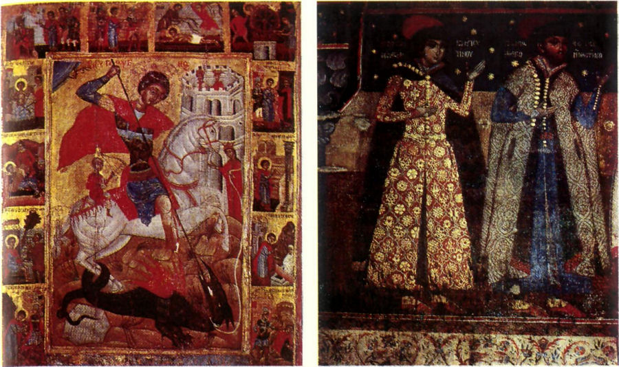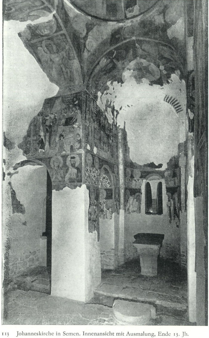 Ein typisches Beispiel dafür liefern die Fresken von Semen, entstanden um 1300. Stil, Ikonographie und Technik bleiben hier eher weit zurück und weisen mehrere Besonderheiten auf, die schon für die Kunst vor den Bilderstürmen charakteristisch sind. Dennoch besitzt die Malerei von Semen eine ungewöhnlich starke Ausdruckskraft, wie sie auch innerhalb der christlich-orthodoxen Kunst selten ist. Das wichtigste Kunstmittel ist hier - wie mehrere Jahrhunderte zuvor - die einfache, feste und kräftig betonte Linie, die breit und sicher ist und sich nicht verflüchtigt. Sie trennt die einzelnen Farbflächen, verstärkt die Konturen und gibt dem Ganzen eine strenge Geschlossenheit. Die Figuren sind einfach und streng, derb und gewaltig. Ihre großen Augen blicken auf den Betrachter mit einer irdischen, bannenden Kraft und halten ihn in ihrer seltsamen, irrealen Welt fest.