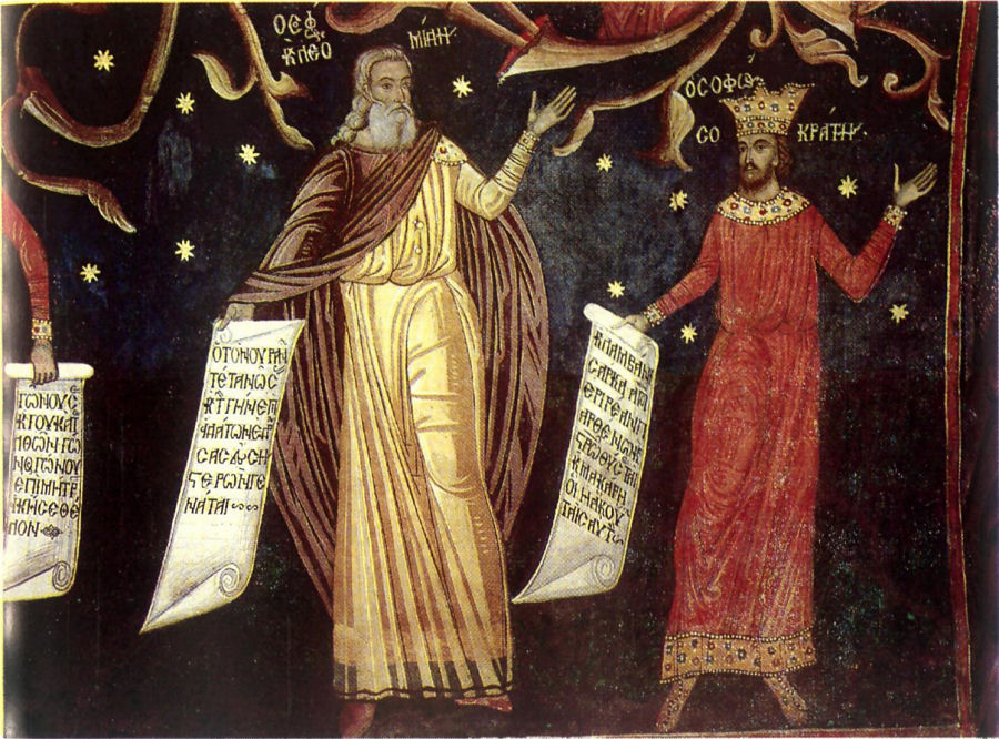 Während ihrer langen Entwicklung behielt die mittelalterliche kirchliche Kunst Bulgariens stets eine enge Bindung zur Antike und ließ sich immer wieder von den antiken Prototypen inspirieren, deren Reflexe in allen Kunstgattungen spürbar sind. Die Gestalten der antiken Philosophen, von der spätmittelalterlichen christlich-orthodoxen Theologie als Vorläufer Christi verstanden, werden in der Malerei häufig in der Genealogie des Menschensohnes als seine geistigen Vorfahren im prachtvollen Kaiserornat und mit Schriftrollen dargestellt, wie hier im Refektorium des Batschkowo-Klosters, wo neben Sokrates auch Platon, Aristoteles, Plutarch und Diogenes zu sehen sind.