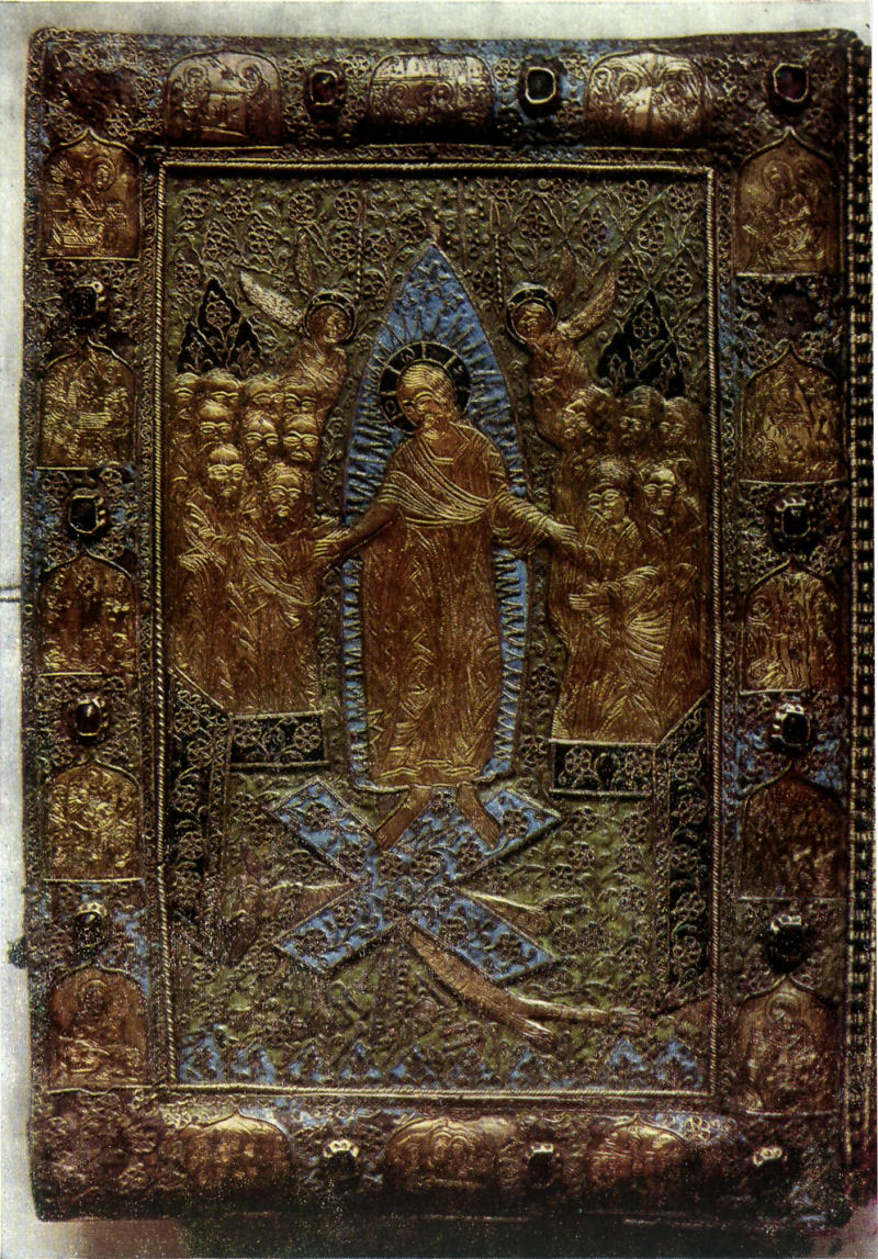 Während die Ikonographie der Hauptdarstellung auf der Rückseite - die Höllenfahrt Christi wird in der christlich-orthodoxen Kunst für das Osterfest verwendet — sowie der anderen Festszenen am Bildrand traditionell ist und nur geringe folkloristische Einwirkungen offenbart, beweist die Formensprache bereits sehr starke Einflüsse der islamischen Kunst: in den Spitzbogenmedaillons, in dem pflanzlichen Ornament, das die ganze Bildfläche ausfüllt, vor allem aber in der Farbgebung des Zellenschmelzes, die von der traditionellen abweicht und arabisch-orientalischen Vorbildern verpflichtet ist.