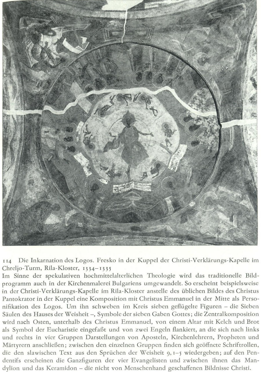 Im Sinne der spekulativen hochmittelalterlichen Theologie wird das traditionelle Bildprogramm auch in der Kirchenmalerei Bulgariens umgewandelt. So erscheint beispielsweise in der Christi-Verklärungs-Kapelle im Rila-Kloster anstelle des üblichen Bildes des Christus Pantokrator in der Kuppel eine Komposition mit Christus Emmanuel in der Mitte als Personifikation des Logos. Um ihn schweben im Kreis sieben geflügelte Figuren - die Sieben Säulen des Hauses der Weisheit Symbole der sieben Gaben Gottes; die Zentralkomposition wird nach Osten, unterhalb des Christus Emmanuel, von einem Altar mit Kelch und Brot als Symbol der Eucharistie eingefaßt und von zwei Engeln flankiert, an die sich nach links und rechts in vier Gruppen Darstellungen von Aposteln, Kirchenlehrern, Propheten und Märtyrern anschließen; zwischen den einzelnen Gruppen finden sich geöffnete Schriftrollen, die den slawischen Text aus den Sprüchen der Weisheit 9,1-5 wiedergeben; auf den Pendentifs erscheinen die Ganzfiguren der vier Evangelisten und zwischen ihnen das Mandylion und das Keramidon - die nicht von Menschenhand geschaffenen Bildnisse Christi.