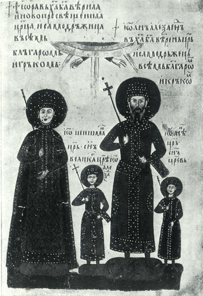Die Stifterbildnisse des Herrscherpaares Zar Iwan Alexander und Zarin Theodora-Sara mit ihren Kindern Iwan Schischman und Iwan Assen sind wie die ganze Gestaltung dieser Prachthandschrift von mittelbyzantinischen illuminierten Handschriften beeinflußt. Die kostbare Ausführung des liturgischen Buches, seine prunkvolle Ausstattung und Einfassung im Goldeinband mit Edelsteinapplikationen werden zum Selbstzweck.
