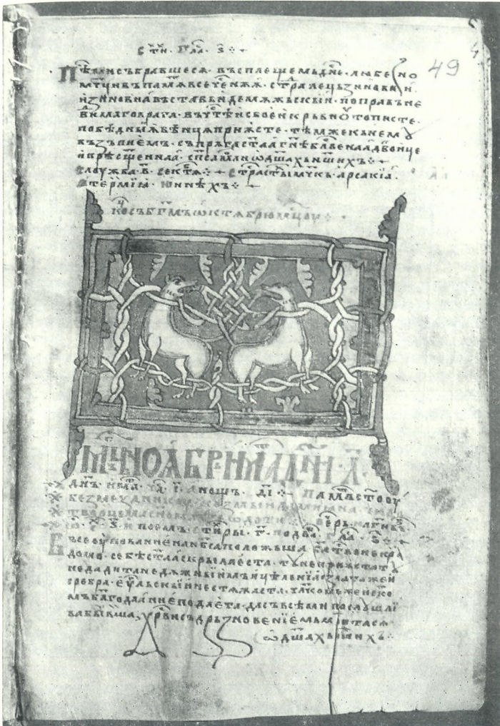 Der archaisierenden Stilrichtung gehören auch eine ganze Reihe von Werken der Buchmalerei des 13. und 14. Jahrhunderts an. An erster Stelle muß hier das Dobrejscho-Evangeliar in der Nationalbibliothek Sofia erwähnt werden — ein bemerkenswertes Beispiel der Unmittelbarkeit und Ausdruckskraft der Volkskunst, aber auch einer langen und ununterbrochenen Tradition, die bis in die Zeit vor dem Bilderstreit zurückreicht. Zugleich läßt sich hier eine der frühesten Erscheinungsformen des sich im 13. Jahrhundert vollständig entfaltenden teratologischen Stils erkennen, dessen erste Ansätze bereits in den glagolitischen Handschriften des 9. Jahrhunderts zu beobachten sind und der die Buchmalerei des westlichen Balkans eine Zeitlang beherrschte.