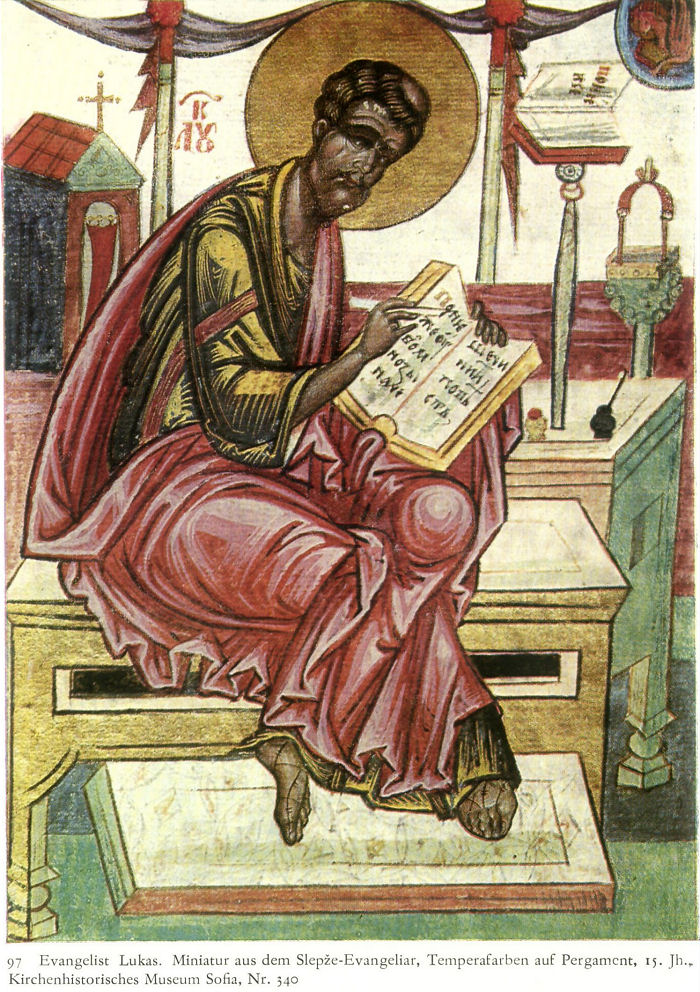 97 Evangelist Lukas. Miniatur aus dem Slepže-Evangeliar, Temperafarben auf Pergament, 15. Jh., Kirchenhistorisches Museum Sofia, Nr. 540