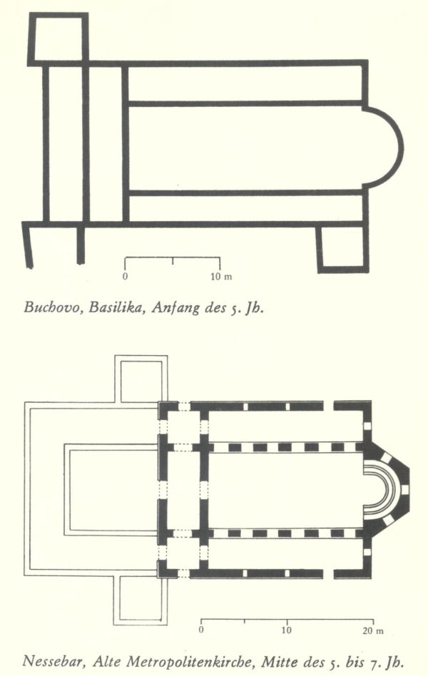 Unter den Bautypen der frühchristlichen Architektur nimmt die Basilika den ersten Platz ein. Sie hatte im Zentralteil des Balkans bereits eine eigene Vorgeschichte und damit eine größere Bedeutung als im Christlichen Osten und blieb bis ins hohe Mittelalter die bevorzugte Bauform, deren Entstehung als Ergebnis der Tätigkeit lokaler Bauschulen auf dem Fundament der hellenistischen und griechisch-römischen Tradition aufzufassen ist. Ihre Entwicklung vollzog sich trotz des beharrenden Konservatismus der christlichen Baukunst. Die basilikale Form war während der Spätantike und des frühen Mittelalters einem ständigen Wandlungsprozeß ausgesetzt, der sowohl von der Entwicklung der Liturgie als auch von gesellschaftlich-ökonomischen und ästhetischen Bedingungen mitbestimmt wurde. Das von der hellenistischen und griechisch-römischen profanen Kunst entliehene Grundschema veränderte sich langsam. Es wird vermutet, daß eine Reihe frühchristlicher Basiliken in Bulgarien aus vorchristlicher Zeit stammen und nur durch geringfügige Umbauten für den christlichen Kultus nutzbar gemacht worden sind. Nach und nach wurden jedoch Funktionen und Proportionen miteinander in Einklang gebracht und das Ganze durch eine einheitliche Konzeption verbunden, wobei funktionelle und ästhetische Momente eine ebenbürtige Rolle spielten.