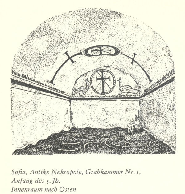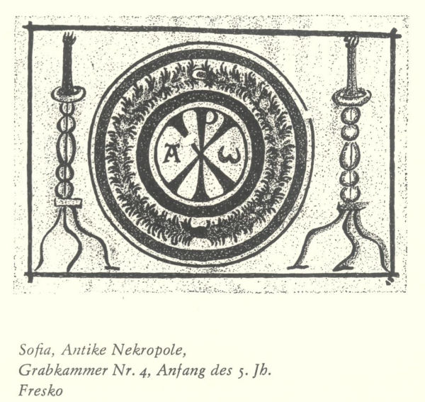 In Bulgarien tritt diese neue Auffassung von der Monumentalkunst erstmalig bei den frühchristlichen Grabkammern in Erscheinung. Wenn sich auch ursprünglich Bildrepertoire und Technik kaum von den Werken der vorchristlichen Kunst (wie der Grabkammer in Silistra) (Abb. 11) unterscheiden, so ist doch die zunehmende Anwendung christlicher Symbole, hauptsächlich von Kreuz und Christogramm, und die verschiedene inhaltliche Akzentuierung antiker Formen bezeichnend. Die Ornamentik ist dem Bildschatz der hellenistischen Antike entliehen, doch in einem bereits streng und konsequent durchdachten ikonographischen Programm noch fester mit dessen symbolischer Funktion verbunden. Unterschiede in Form und Stil zwischen den vorchristlichen und christlichen Kunstwerken, wenn man solche überhaupt feststellen kann, ergeben sich aus der großen Spannweite in der künstlerischen Qualität - von den mit höchster Perfektion ausgeführten Darstellungen der Erzengel aus der leider nicht mehr erhaltenen Grabkammer Nr. 9 in Serdica, (Abb. 10) einem erlesenen Denkmal antiker Kunst, bis zu den primitiven ornamentalen und figuralen Darstellungen in Varna.