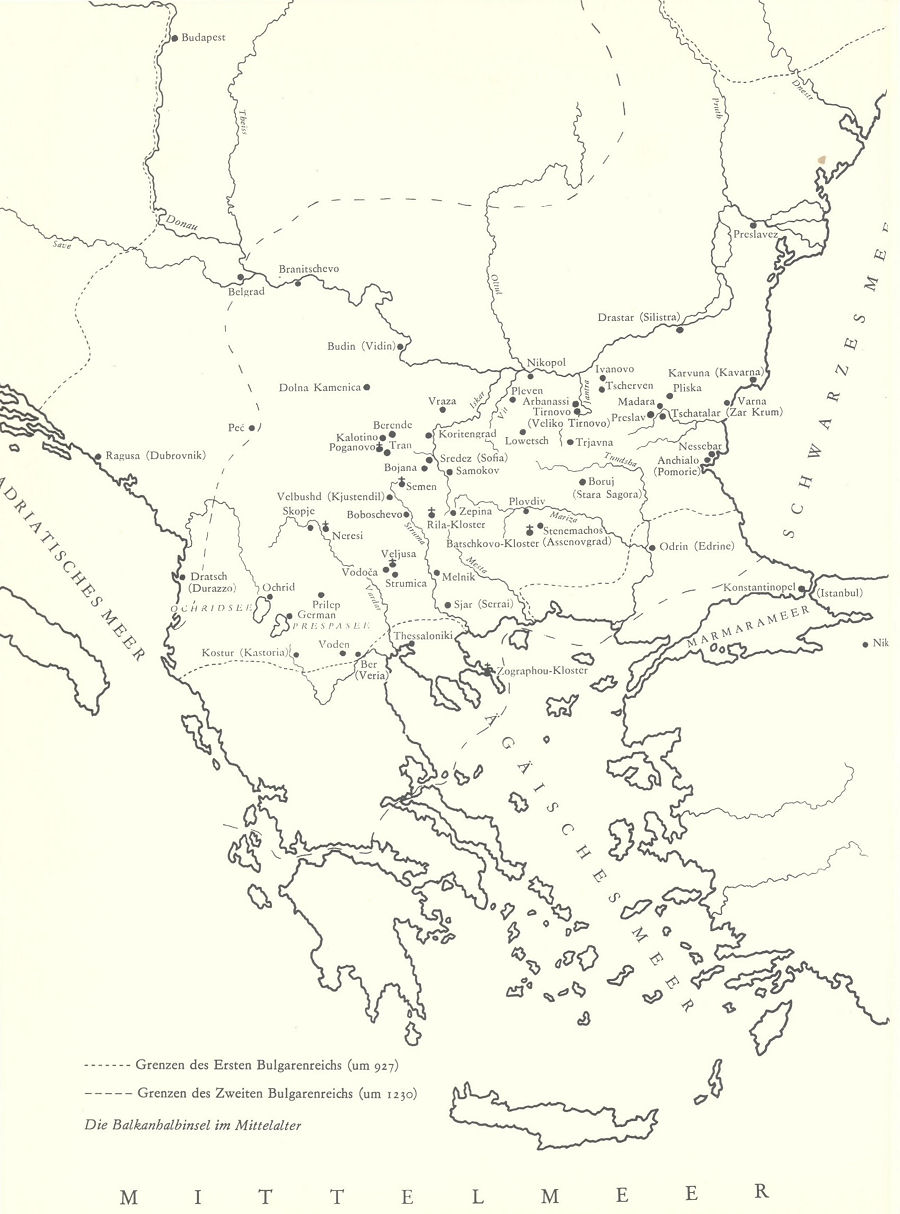 Innerhalb der folgenden drei Jahrhunderte kam dieser neuentstandenen Großmacht in der politischen und kulturellen Entfaltung Südosteuropas eine ähnliche Bedeutung zu wie dem Reich Karls des Großen und seiner Nachfolger für Westeuropa. Wie das Reich der Franken 'das Fundament zur Einigung eines bunten Konglomerats unterschiedlicher Völkerstämme in einem Staat schuf und sie durch die neue Staatsreligion fest an sich zu binden vermochte, so vereinigte auch das Bulgarenreich die in ihrer ethnischen Zusammensetzung uneinheitliche Balkanbevölkerung - die aus Mittelasien kommenden Protobulgaren, die ein Jahrhundert zuvor von den osteuropäischen Randgebieten umgesiedelten Slawen, die zum Teil romanisierten und zum Teil hellenisierten Einwohner der großen Balkanstädte sowie die nach den zahlreichen Kriegen und Einfällen mehrerer Nomadenvölker vermischte und stark reduzierte Urbevölkerung. Durch die Verschmelzung dieser Völkerschaften entstand zugleich mit der inneren und äußeren Festigung des neuen Reichs bis zum 9. Jahrhundert eine neue ethnische Einheit, deren Herausbildung durch die Einführung des Christentums als Staatsreligion im Jahre 865 zu einem gewissen Abschluß gelangte, wobei neben der einigenden Staatsmacht und Religion die neugeschaffene slawisch-bulgarische Schrift als Grundlage der nationalen Literatur, Kultur und Kunst eine wichtige Bindekraft besaß.