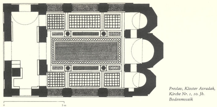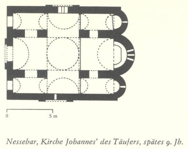 In der Architektur Bulgariens aus dem späten 9. und frühen 10. Jahrhundert nehmen zwei Bauwerke eine Sonderstellung ein: die vermutlich ursprüngliche Kathedrale und die Goldene Runde Kirche in Preslav (Abb. 40). Die erste, auch als Kirche am Winkel der Innenstadtmauer bekannt, stellt eine fünfschiffige Kreuzkuppelanlage mit Synthronon und weitem Narthex dar, in der Folgezeit zweimal durch Umbauten verkleinert. Ihr Grundriß wiederholt sich später an der Kathedrale von Mokwi, Abchasien (um 955-967), an der Desjatin-Kirche (989 bis 996) und an der Kirche des Irenen-Klosters in Kiew sowie in weiterentwickelter Form mit Außengalerien an der Kiewer Sophienkathedrale (n. Jh.).
