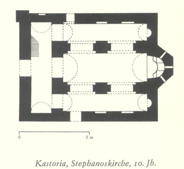 Es entstand eine Variante des basilikalen Bautypus, deren Grundriß sich von dem kleinerer Kreuzkuppelkirchen mit eingebauten Eckräumen kaum unterscheidet. Infolge des unzureichenden Erhaltungszustandes sind Rückschlüsse auf den ursprünglichen Bautypus solcher Anlagen, zum Beispiel der Kirchen Nr. 5, 8, 36 und der sogenannten Bojarenkirche in Pliska, nur bedingt möglich. Wir können diese basilikale Sonderform dennoch auch an einer Reihe weiterer Bauten verfolgen, deren ursprünglicher Zustand kaum beeinträchtigt wurde, so vor allem an der Stephanoskirche in Nessebar und den drei Kirchen in Kastoria - Hagioi Anargyrioi, Hagios Stephanos und Archont Michael. Alle diese Kirchen weisen, unabhängig von ihrer unterschiedlichen Dachform und Trennung der Schiffe, gleichermaßen verkürzte Proportionen und nach oben strebende Mittelschiffe auf, so daß sich ihr Raumverhältnis dem der Kreuzkuppelkirche annähert. Gleichzeitig tendieren diese Kirchen, wie die von Pliska, zu der für das späte 10. Jahrhundert charakteristischen malerischen Gestaltung und Gliederung der Fassaden.
