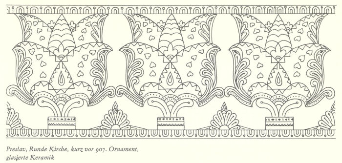 Die glasierte Keramik findet vielseitige Anwendung bei den repräsentativen Bauten in Preslav nicht nur als Fassadenschmuck, sondern auch in Form von großen und kleinen bemalten Platten für die Verkleidung der Außen- und Innenwände sowie als Bodenbelag. Der Bildschmuck reicht von abstrakten geometrischen Figuren, oft in sehr komplizierten profilierten und durchbrochenen Formen (die große Rosette im Nationalmuseum Sofia) (Abb. 48), bis zum stark stilisierten Pflanzenornament und Heiligenbildnis. Im ornamentalen Motivschatz, in dem die christliche und die islamische Kunst Vorder- und Mittelasiens deutlich nachleben, kehrt das als Symbol der Auferstehung im Hochmittelalter durch die Kreuzfahrer auch ins Abendland gelangte Motiv der Rose von Jericho häufig wieder. Innerhalb der bulgarischen Baukunst erscheint dieses Motiv erstmalig auf der Preslaver Keramik und gehört seitdem bis zum Ausgang des Mittelalters zum festen ornamentalen Dekor der Bauten.