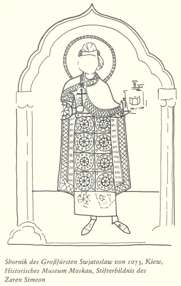 Mit ebenso großer Wahrscheinlichkeit stellt das Bildnis des Fürsten Boris in einer weiteren russischen Handschrift, dem Sammelband ausgewählter Sonntags-Perikopen mit Kommentaren, verfaßt von Konstantin von Preslav (Historisches Museum Moskau), die Kopie einer bulgarischen Miniatur vom Ende des 9. Jahrhunderts, gleichfalls eine Nachbildung Preslaver Mosaiks, dar. Auf Grund der erhaltenen Mosaikwürfel ergibt sich, daß die Wandbilder einen goldenen Hintergrund hatten, doch im Unterschied zu den zeitgenössischen byzantinischen Mosaiken außer aus Glas auch aus vielen farbigen Keramikwürfeln bestanden, wodurch sich das Kolorit wesentlich von dem byzantinischer Mosaiken unterschieden haben dürfte.