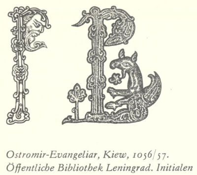 Diese Bezeichnung, im vorigen Jahrhundert von F. Buslajew eingeführt und von der späteren Forschung aufgenommen, umfaßt alle Erscheinungen sonderbarer phantastischer Darstellungen von Ungeheuern, die das Ornament der ostslawischen Kunst beherrschen. Die ersten Ansätze dieser Formen finden sich bereits an den frühen glagolitischen Manuskripten, (Abb. 47) wie dem Codex Zographensis und dem Sinaitischen Euchologion. Hier treten die phantastischen Motive zunächst andeutungsweise auf - sie bilden sich von den blattartigen Endungen der Initialen heraus, die sich durch Einsetzen von Augen in Ungeheuer verwandeln und allmählich den Manuskripten ein eigenartiges Gepräge verleihen. Den Übergang von glagolitischen zu kyrillischen Buchinitialen veranschaulicht der Codex Suprasliensis aus dem frühen 10. Jahrhundert, ein Werk ostbulgarischer Provenienz und zugleich ein wichtiges Bindeglied in der Entwicklung der Buchornamentik vor deren Blüte im zweiten Viertel des 10. Jahrhunderts.