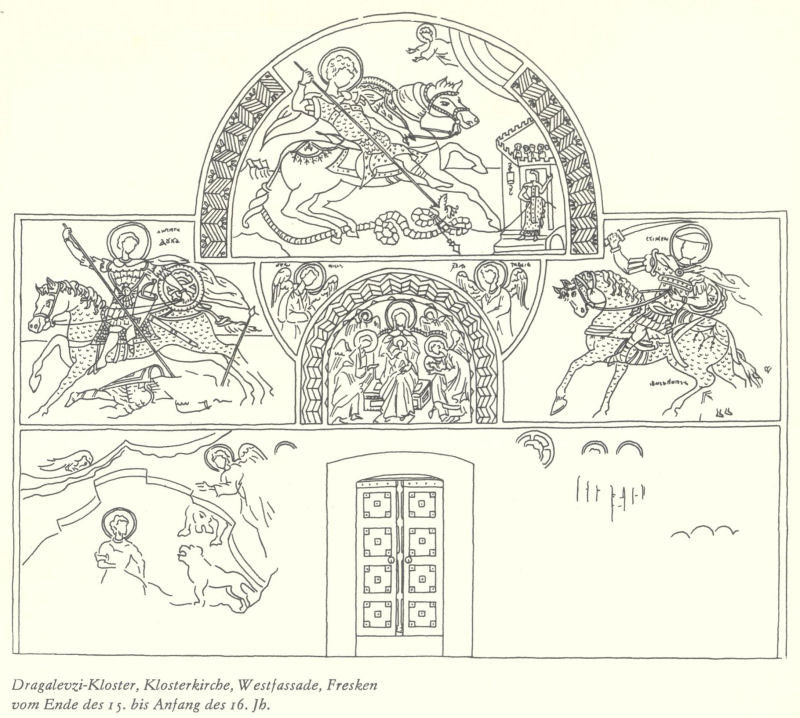 Unabhängig von diesem Stilwandel bewahren die südwestlichen Gebiete Bulgariens während des ganzen späten Mittelalters eine starke Bindung an die Tradition in Stil und Technik, die man an einer Reihe von Denkmälern der Monumentalmalerei, wie des Demetrios-Klosters bei Boboschevo (1488), der Dorfkirchen in Mariza (Ende des 16. Jh.) (Abb. 184 bis 189) und Mala Zarkva sowie der Klosterkirchen in Alino und Seslavzi (Anfang des 17. Jh.), verfolgen kann. Neben mehreren ikonographischen Typen der frühchristlichen Kunst findet man auch eine Wiederbelebung der frühchristlichen Formensprache.