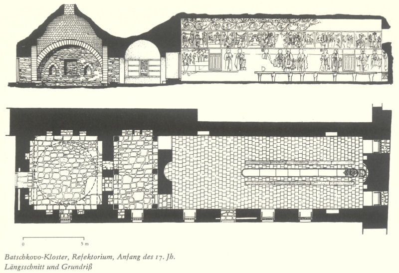 o Batschkovo-Kloster, Refektorium, Anfang des 17. Jh. Längsschnitt und Grundriß 78