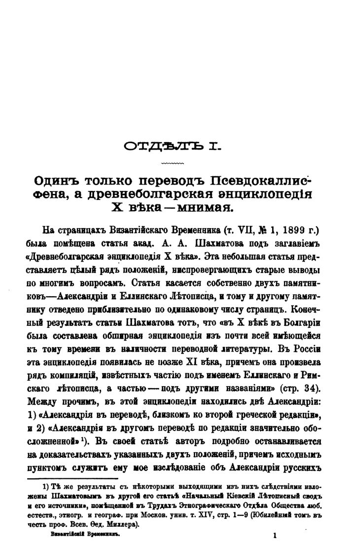 На страницахъ Византійскаго Временника (т. VII, № 1, 1899 г.) была помѣщена статья акад. А. А. Шахматова подъ заглавіемъ «Древнеболгарская энциклопедія X вѣка». Эта небольшая статья представляетъ цѣлый рядъ положеній, ниспровергающихъ старые выводы по многимъ вопросамъ. Статья касается собственно двухъ памятниковъ—Александріи и Еллинскаго Лѣтописца, и тому и другому памятнику отведено приблизительно по одинаковому числу страницъ. Конечный результатъ статьи Шахматова тотъ, что