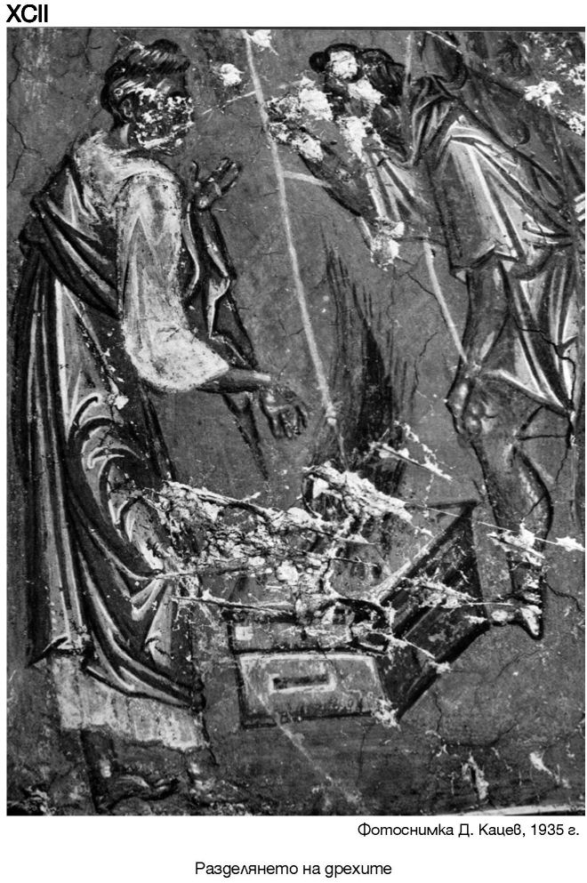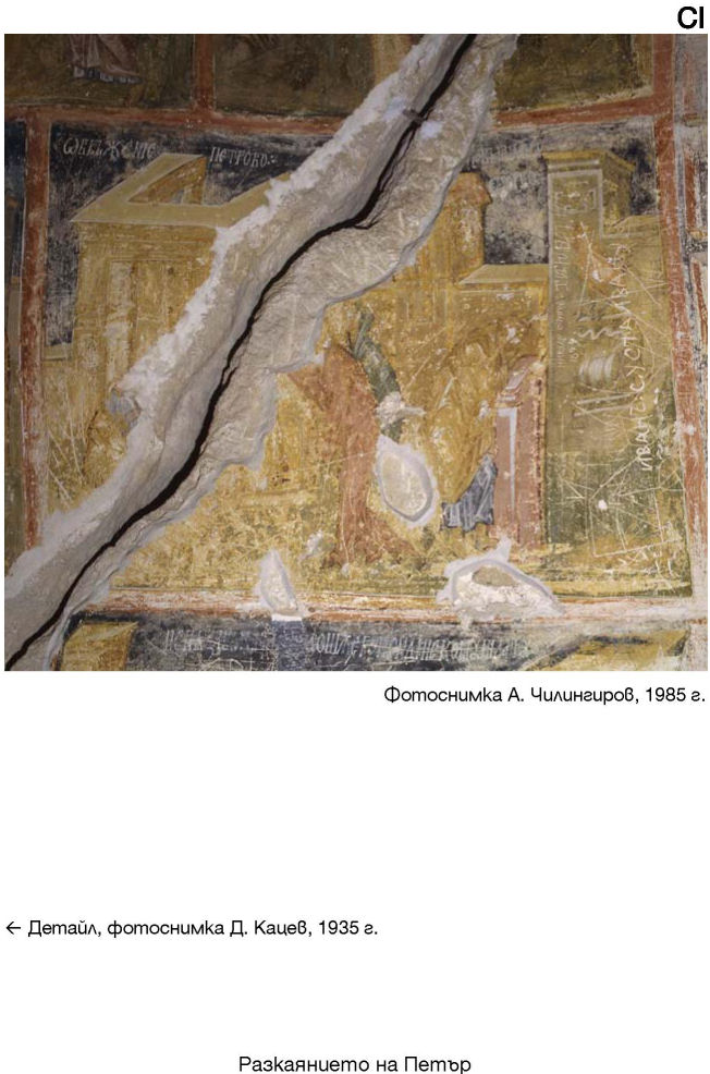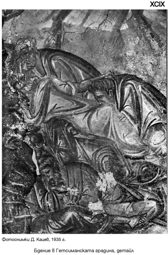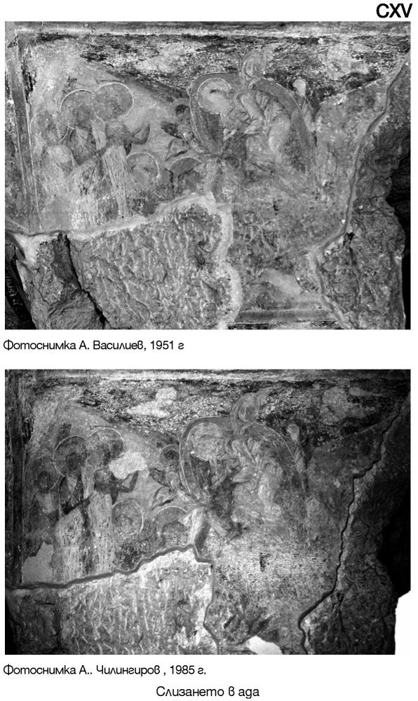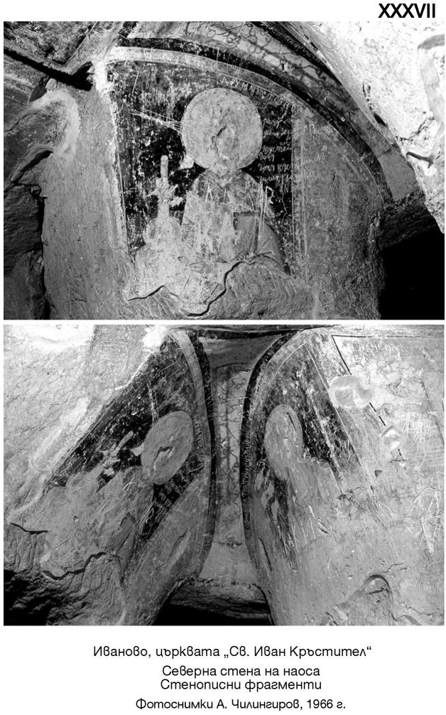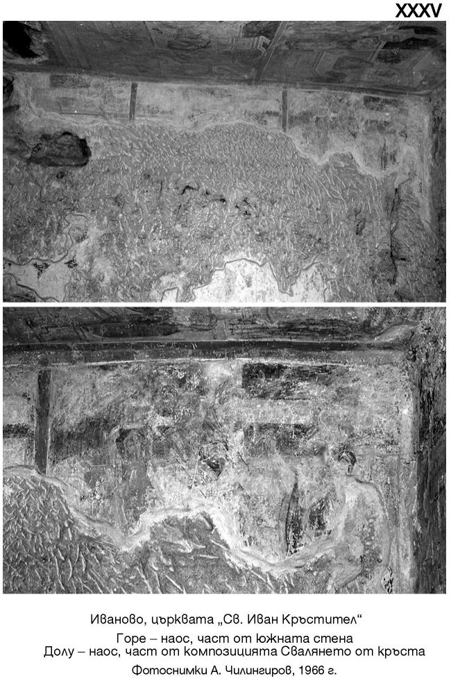 XXXV. Горе - наос, част от южната стена. Долу - наос, част от композицията Свалянето от кръста. Фотоснимки А. Чилингиров, 1966 г.