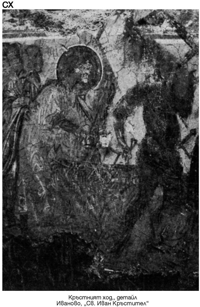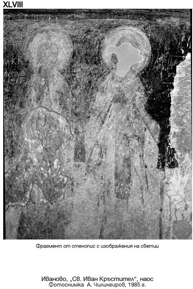 XLVIII. Фрагмент от стенопис с изображения на светци. Иваново, „Св. Иван Кръстител“, наос. Фотоснимка А. Чилингиров, 1985 г.