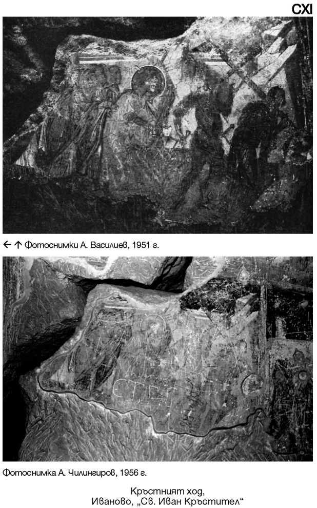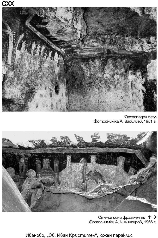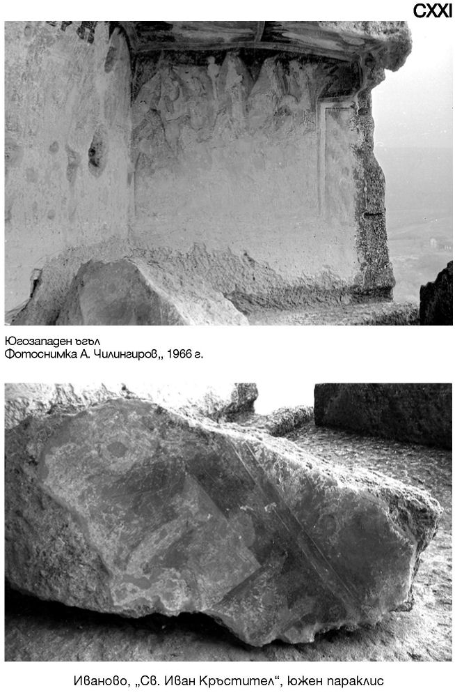 CXX. Иваново, „Св. Иван Кръстител“, южен параклис. Югозападен ъгъл. Фотоснимка А. Василиев, 1951 г. / Стенописни фрагменти. Фотоснимки А. Чилингиров, 1966 г.