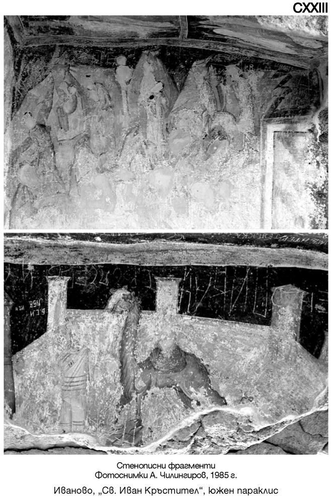 CXXIII. Иваново, „Св. Иван Кръстител“, южен параклис. Стенописни фрагменти. Фотоснимка A. Чилингиров, 1985 г.