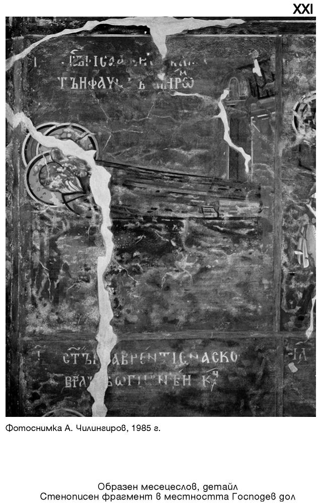 XXI. Образен месецеслов, детайл. Стенописен фрагмент в местността Господев дол. Фотоснимка А. Чилингиров, 1985 г.