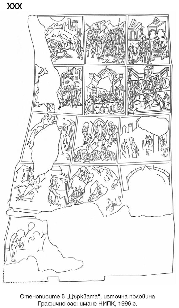 XXX. Стенописите в „Църквата“, източна половина. Графично заснимане НИПК, 1996 г.