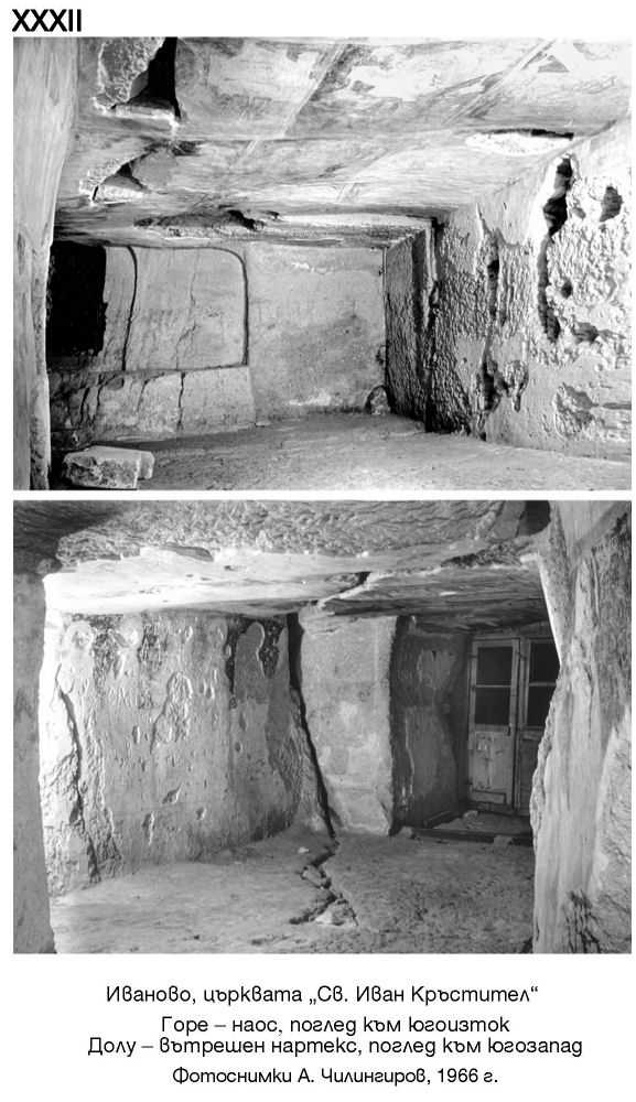 XXXII. Иваново, църквата „Св. Иван Кръстител“. Горе - наос, излед към югоизток. Долу - вътрешен нартекс, поглед към югозапад. Фотоснимки А. Чилингиров, 1966 г.