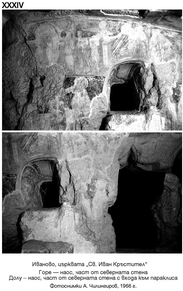 XXXIII. Иваново, църквата „Св. Иван Кръстител“. Горе - наос, източна стена. Долу - наос, североизточен ъгъл с входа към параклиса. Фотоснимки А. Чилингиров, 1966 г.