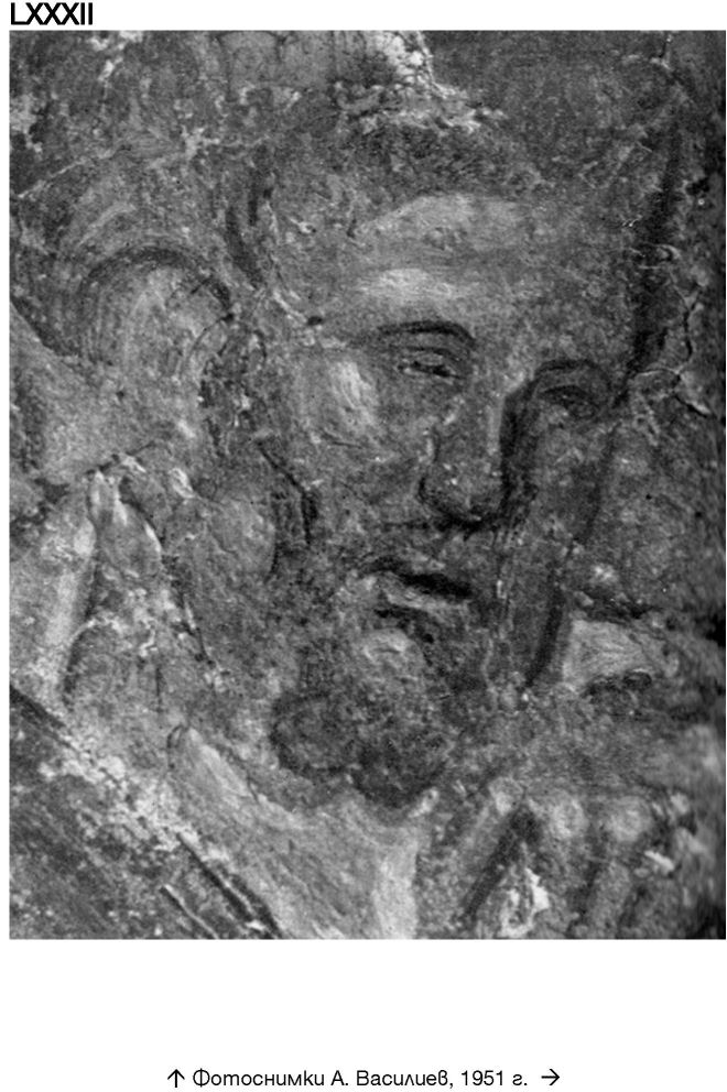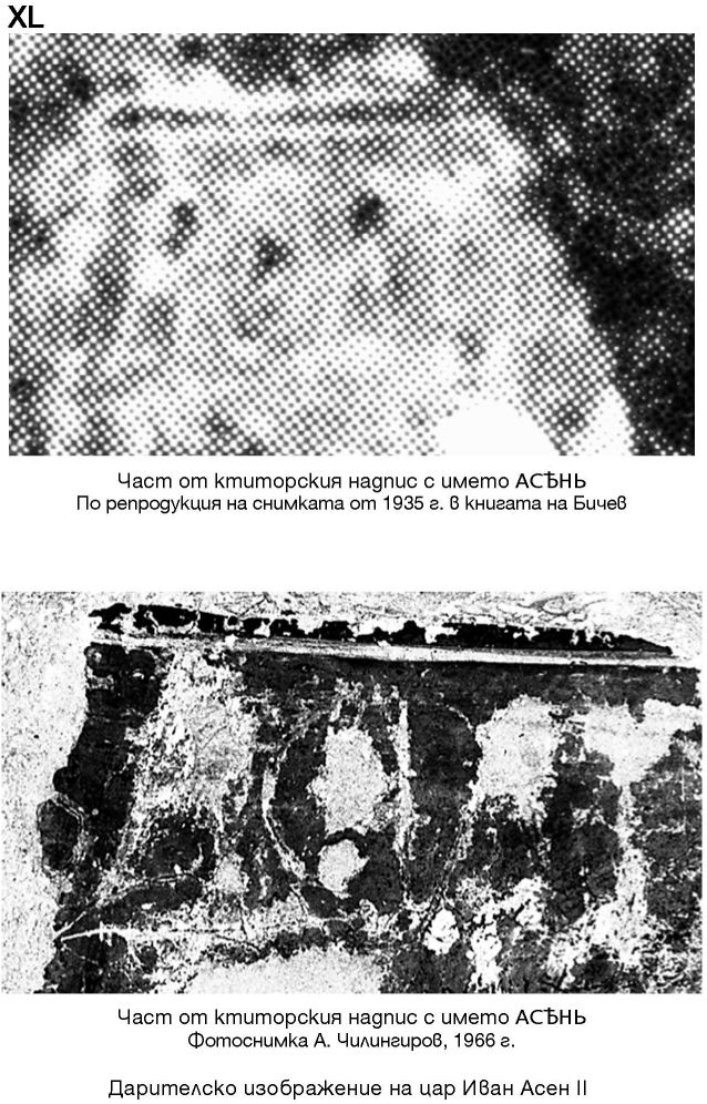 XL. Част от ктиторския надпис с името АСѢНЬ. По репродукция на снимката от 1935 г. в книгата на Бичев / Част от ктиторския надпис с името АСѢНЬ. Фотоснимка А. Чилингиров, 1966 г. Дарителско изображение на цар Иван Асен II