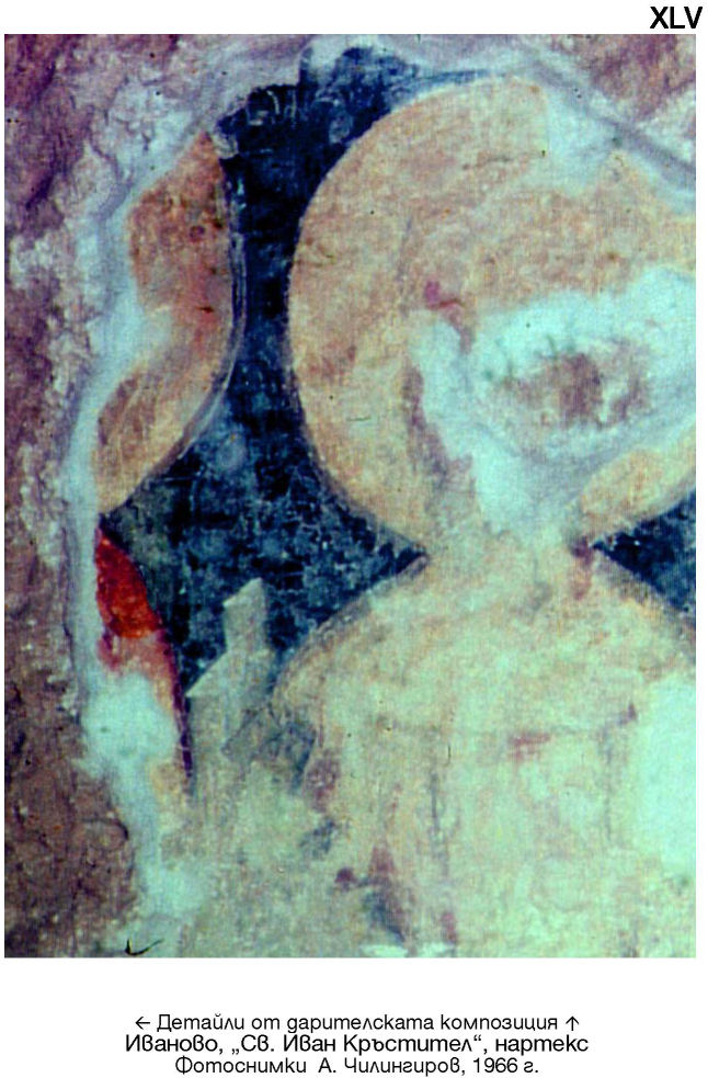 XLIV. Детайли от дарителската композиция. Иваново, „Св. Иван Кръстител“, нартекс. Фотоснимки А. Чилингиров, 1966 г.
