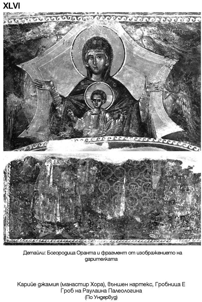 XLVI. Детайли: Богородица Оранта и фрагмент от изображението на дарителката. Карийе джамия (манастир Хора), външен нартекс, Гробница Е. Гроб на Раулаина Палеологина (По Ундервуд)