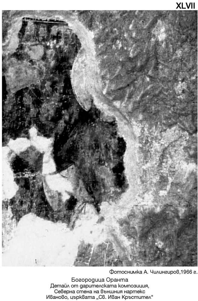 XLVII. Фотоснимка А. Чилингиров, 1966 г. Богородица Оранта. Детайл от дарителската композиция, Северна стена на външния нартекс. Иваново, църквата „Св. Иван Кръстител“