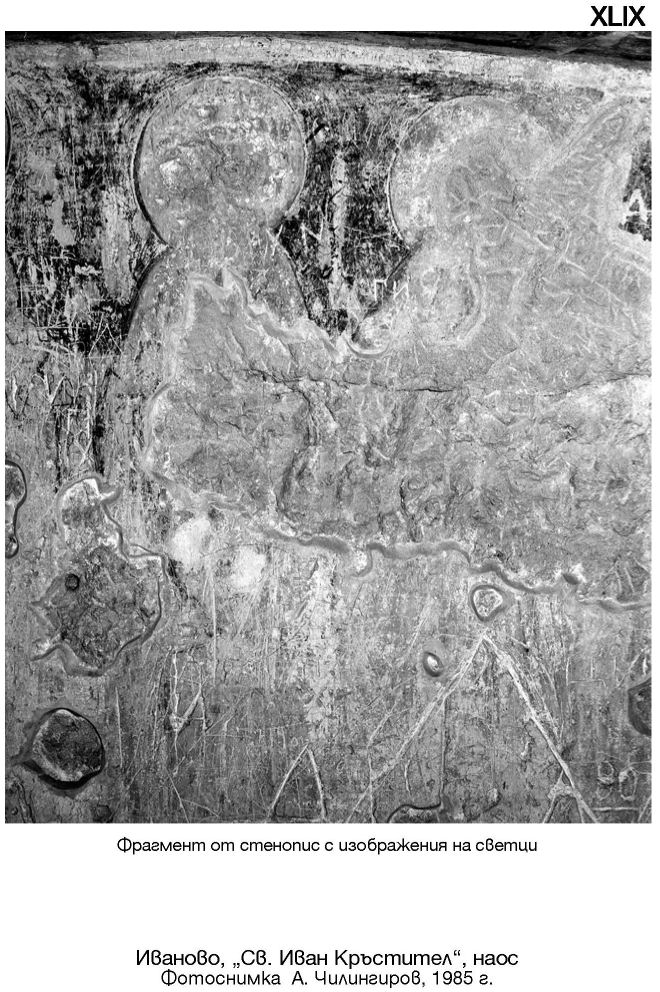 XLIX. Фрагмент от стенопис с изображения на светци. Иваново, „Св. Иван Кръстител“, наос. Фотоснимка А. Чилингиров, 1985 г.